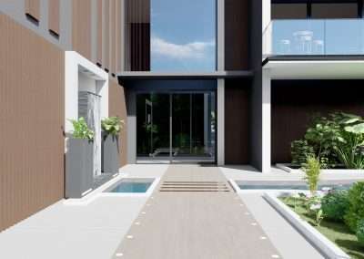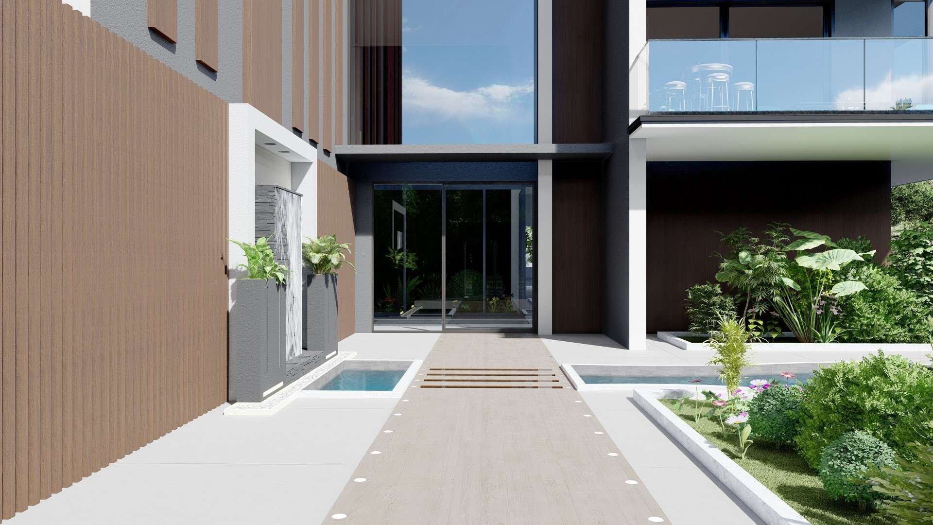 Η είσοδος της πολυκατοικίας είναι ιδιωτική και διαθέτει μεγάλο κήπο με ένα όμορφο σιντριβάνι το οποίο συμβάλει επιτυχώς στη διαμόρφωση ενός ήρεμου και ισορροπημένου χώρου.